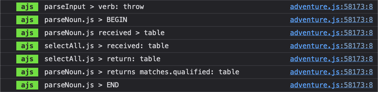 AdventureJS can also print a firehose of deeper status information to the browser's developer console. You can choose what prints to the console through options in game.settings. Here's a very small example.