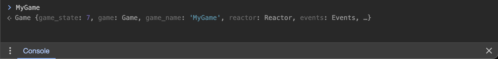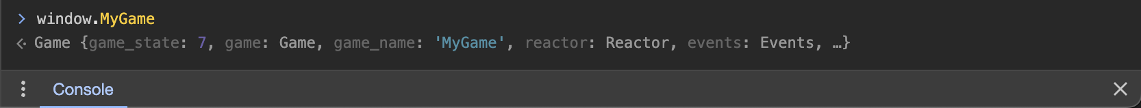 Anyhoo, this first statement is creating a variable named MyGame that is scoped to the browser window, which is a way of saying that it's a global variable that's available anywhere. If you open the browser's developer console and type "MyGame" you should see something like this.