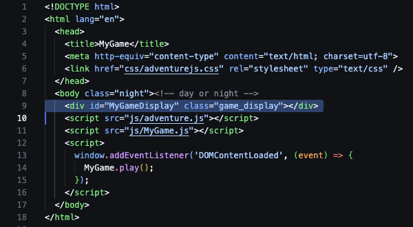 See line 9. What we've done here is to create an HTML element with class "ajs-display" to be the container of the game. We pass that element's ID in to the Game constructor, and AdventureJS creates all the other HTML elements needed to run the game. If you don't pass an HTML element ID, AdventureJS will create an element for you and append it to document.body.